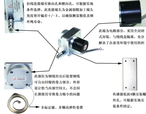 拉線位移傳感器可將機械位移量轉(zhuǎn)換成可計量的、成線性比例的電信號。當(dāng)被測物體產(chǎn)生位移時,拉動與其相連接的傳感器繩索,繩索帶動傳感器傳動機構(gòu)與編碼器同步轉(zhuǎn)動;當(dāng)位移反向移動時,傳感器內(nèi)部的自動回旋裝置將自動收回繩索,并在繩索伸收過程中保持其張力不變;從而輸出一個與繩索移動量成正比例的電信號。 傳感器具有獨立自動排線機構(gòu),保證拉伸繩自動均勻排線、保證傳感器具有高獨立線性精度和較長的傳感器使用壽命。